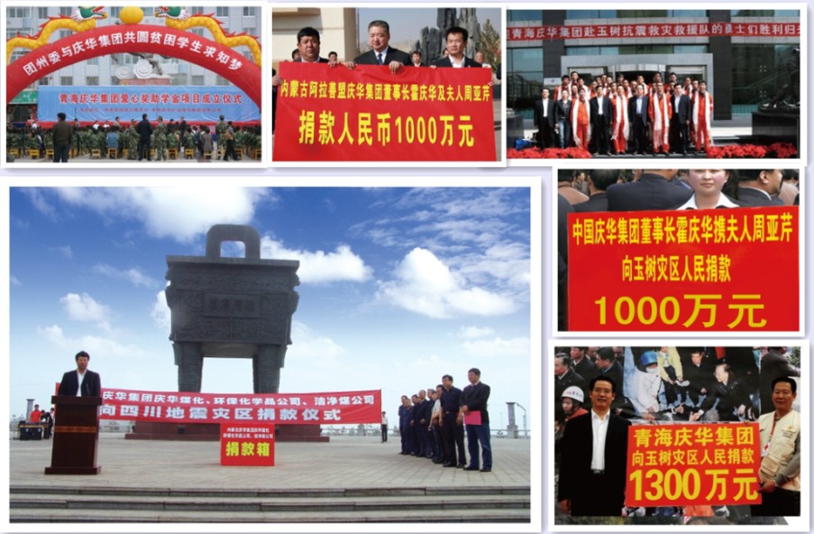 中國慶華集團按照“關(guān)注社會,奉獻愛心,扶貧濟困、慈善為懷”的原則,采取有效措施,使公司扶貧和公益捐助活動深入扎實開展,不斷為貧困學(xué)子、殘疾人、困難群眾、災(zāi)區(qū)人民送去愛心和希望。多年來,中國慶華集團不斷以各種形式直接資助幫扶社會團體及個人,資助總額已超5億元。